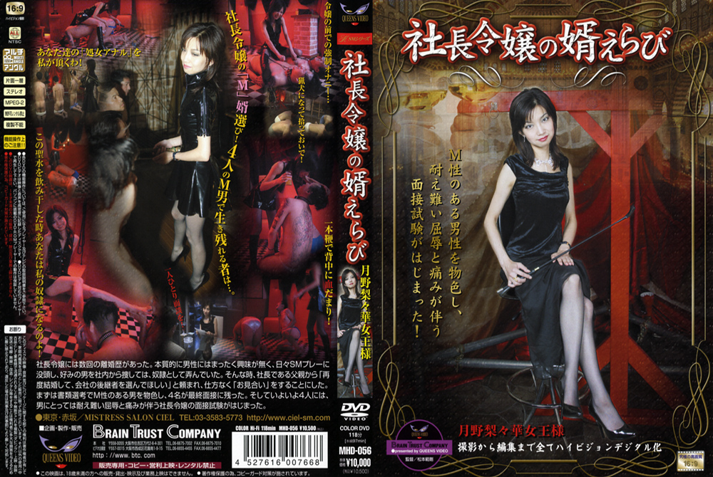 社長令嬢には数回の離婚歴があった。本質的に男性にはまったく興味が無く、日々SMプレーに没頭し、好みの男を社内から捜しては、奴隷として弄んでいた。そんな時、社長である父親から「再度結婚して、会社の後継者を選んでほしい」と頼まれ、仕方なく「お見合い」をすることにした。まずは書類選考でM性のある男を物色し、4名が最終面接に残った。そしていよいよ4人には、男にとっては耐え難い屈辱と痛みが伴う社長令嬢の面接試験がはじまった。